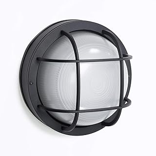 CORAMDEO Outdoor 10” Round LED Nautical Bulkhead Light, Flush Mount for Wall or Ceiling, Wet Location, 125W of Light, 1250 Lumens, 3K, Black Cast Aluminum with Frosted Glass Lens