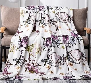 DaDa Bedding Soft Fleece Throw Blanket - Plush Warm Animal Lover House Warming Decor Gift Idea While TV Blossom Wonderland Floral Spring Time Birds - Elegant Orchid Purple & Olive Green - 50" x 60"