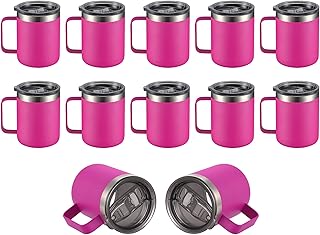 12オンス ステンレススチール 断熱コーヒーマグ ハンドル付き 二重壁真空トラベルマグ タンブラーカップ スライド式蓋付き フクシア 12個パック
