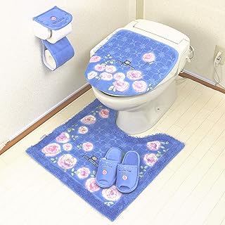 トイレマット 3点セット ロング ブルー ペーパーホルダーカバー おしゃれ 日本製 抗菌 防臭 北欧 バラ 花 (洗浄暖房 普通 共用) オカ チェルシー