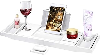 VIVOHOME 拡張可能 43インチ 竹製 バスタブキャディトレイ スマートフォン タブレット ブックホルダー 石鹸トレイ ワイングラススロット ホワイト