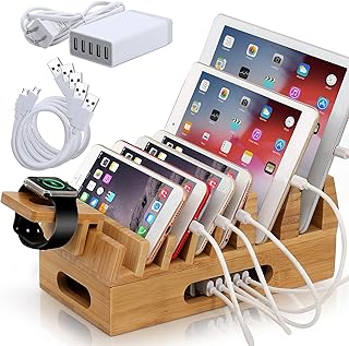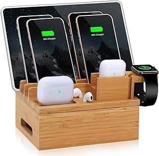 竹製充電ステーション 複数のデバイスオーガナイザー デスクトップ木製ドッキングステーションホルダー 携帯電話 腕時計 タブレット パッド (USB充電器&充電器ケーブル5本&時計スタンド付き)